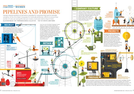For the June/July issue of Working Mother magazine, Tremendousness was asked to design and illustrate a feature spread to show the multistep process by which companies recruit, hire, retain, prepare, and promote multicultural women. The magazines's Creative Director Eric Siry envisioned the process as a "Rube Goldbergian" machine.