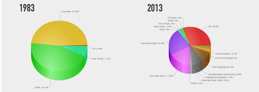 - 30 Years of Music Industry Change | Vinyl, cassette, CD, digital, etc—all pie-charted out for you.