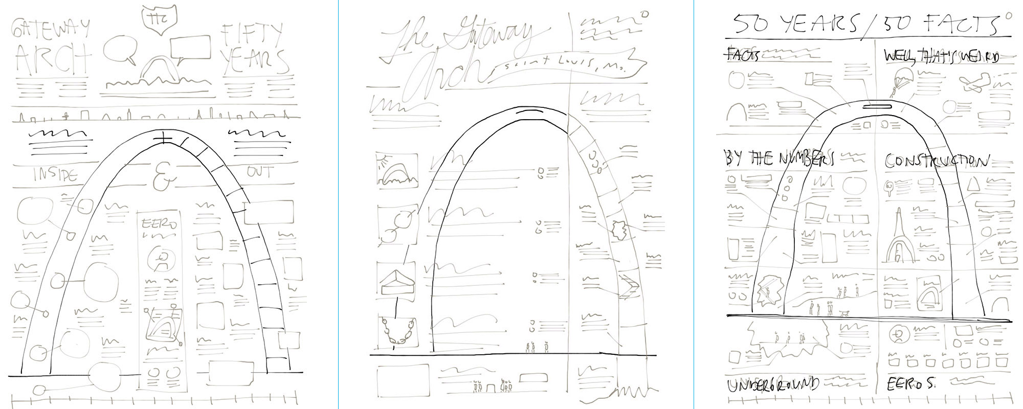 With a general idea of what we wanted to say—and specifically to get a good deal of discrete, lesser-known Arch facts into the piece—I began doing rough napkin sketches. This is usually the first visual phase of any project. You've got to capture a variety of rough ideas, iterate quickly, and share them with others. If I'm not using actual paper, I use Fifty Three's 'Paper' app on the iPad. There are lots of nice choices out there, but it's the least complicated drawing app that still maintains a finesse and a quality to its output. Others do more and are correspondingly difficult to understand, and others do less and provide a lower quality look. Paper is my Goldilocks.