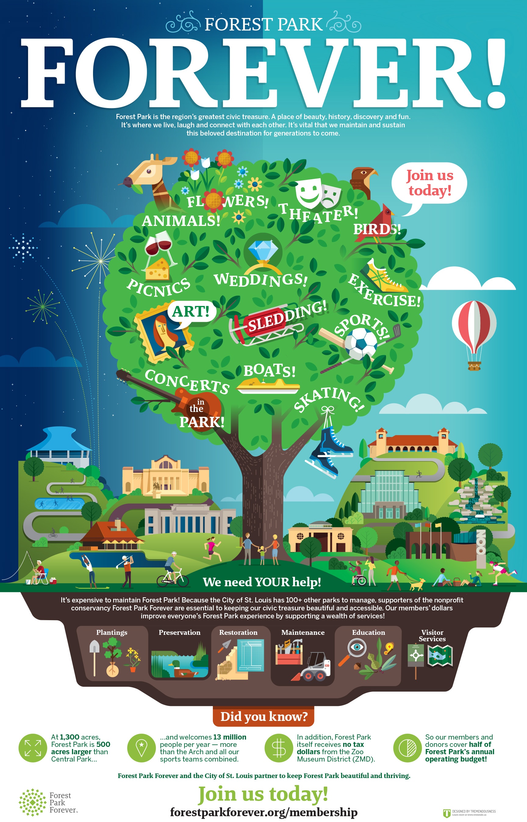 St. Louis' Forest Park Forever wanted an information-filled graphic to compel supporters to donate or to become a full member. Because of our love for (and proximity to—we're just a block away) Forest Park, we didn't want to address this in a typical, boring "by-the-numbers" infographic approach.