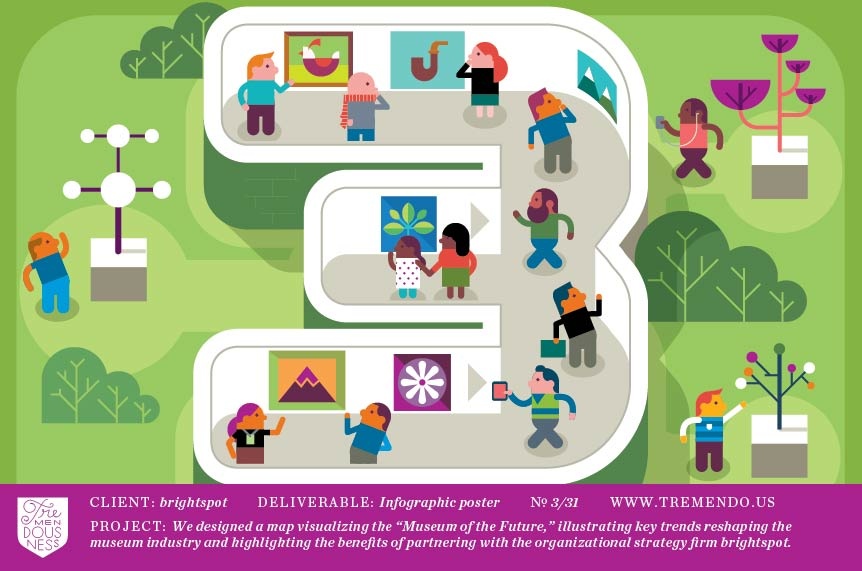 - PROJECT: We designed a map visualizing the “Museum of the Future,” illustrating key trends reshaping the museum industry and highlighting the benefits of partnering with the organizational strategy firm brightspot.