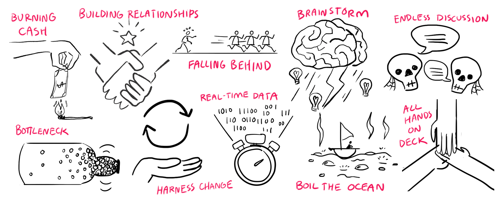 As with many skills, the only way to get better at this challenge was to practice. For a while, we tried drawing vague prompts on the wall in the office here and there—usually various categories like “people,” “animals,” and “words”—but the lack of structure and contextual time pressure made this practice difficult to translate into session work. Eventually, our colleague Drew suggested we implement a daily exercise: he would give us a business concept (like “brainstorming” or “speed to market”), and we would have to draw it within a minute and send our drawings to him. He would then give us a couple suggestions on possible improvements and show us his own drawing for the concept.