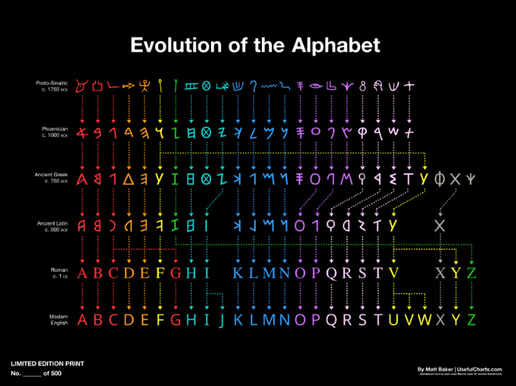 - Evolution of the Alphabet | "This is a limited edition print. Only 975 have been produced and it will not be printed again. All are numbered and hand-signed by the designer. The chart shows how the letters used to write English (and many other languages) evolved from Proto-Sinaitic, through Phoenician, early Greek and early Latin, to their present forms. You can see how some letters were dropped and others ended up evolving into more than one letter. Please note that this chart focuses on the evolution of the letter shapes, not their sounds."