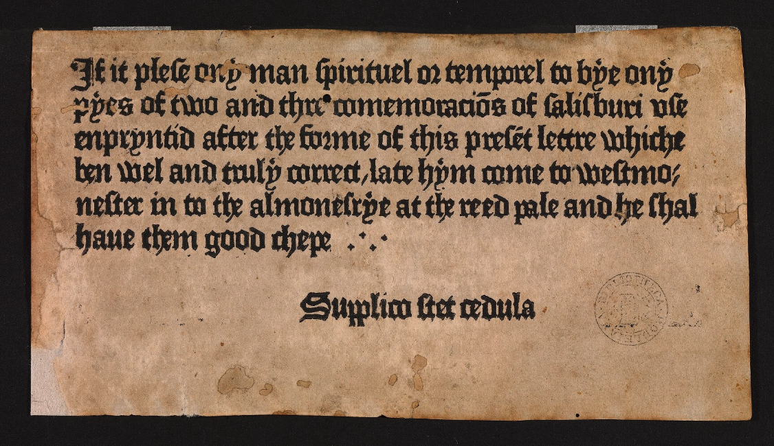 - The Oldest Surviving Printed Advertisement in English | "One of the smallest advertisements surviving from before the close of the Middle Ages dates from 1476/1477 and was produced by William Caxton, Britain’s first printer. This piece of paper, of which two copies survive, is regarded as the earliest surviving printed advertisement in the English language. It promotes Caxton’s Sarum Pie, or the Ordinale ad usum Sarum, a handbook for priests."