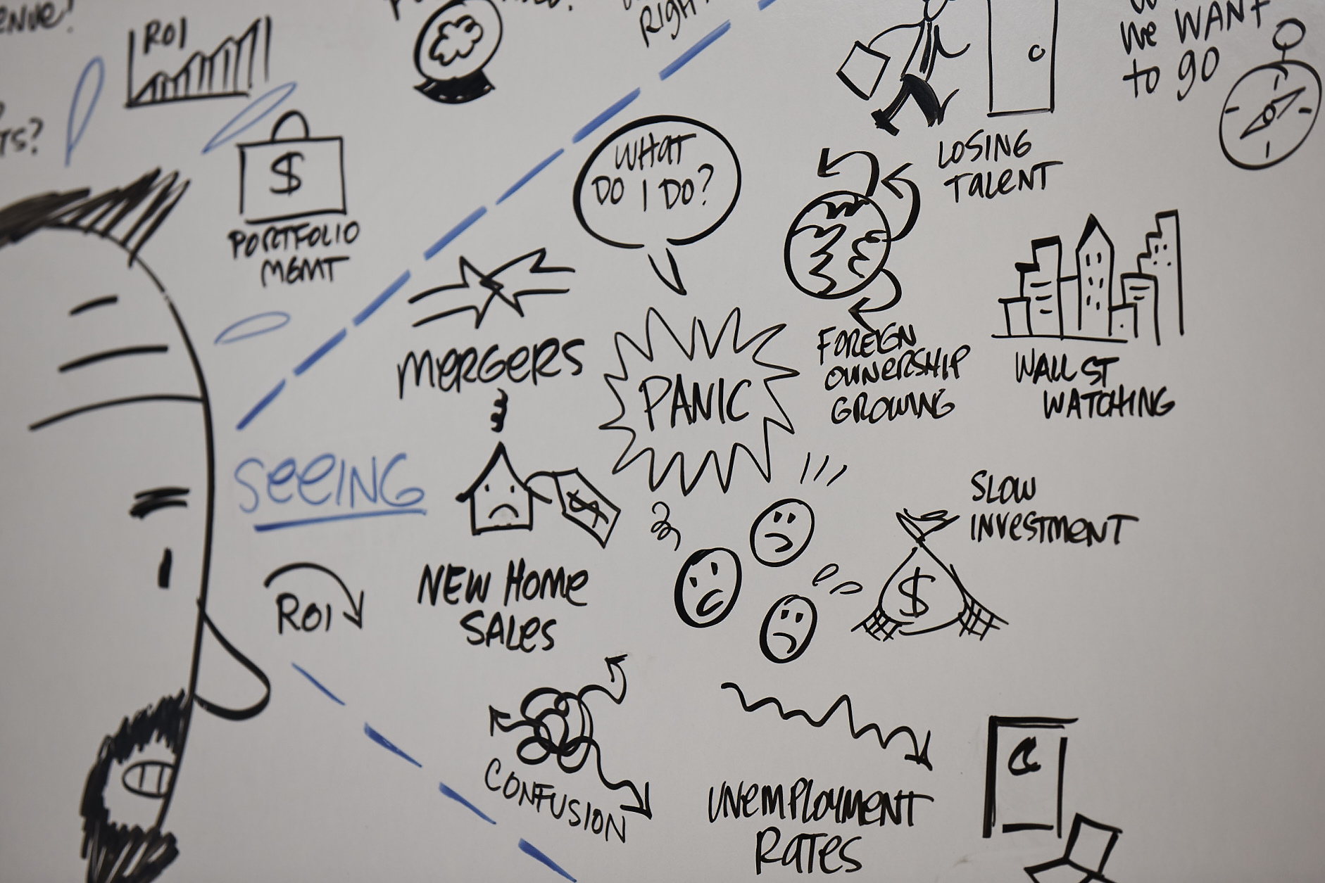 But the truth is that facilitated discovery or ideation sessions featuring live sketching is an efficient and engaging way to collaboratively flesh out ideas and solutions. Usually just the act of dedicating a block of time with limited distractions—usually a half or full day—will allow your team to generate ideas and uncover insights that were otherwise inaccessible. Many of our projects begin this way, although the visualization can even happen via virtual meetings when needed. It’s an invigorating process that results in actionable content, and people leave the room nodding in agreement.